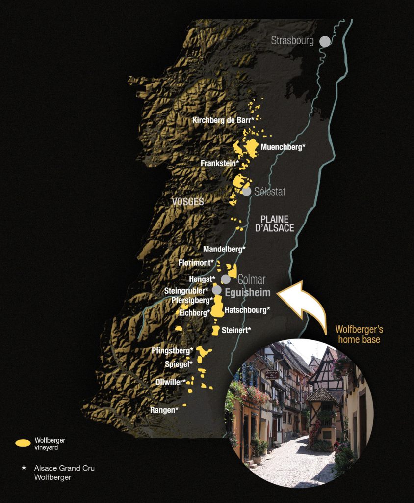 The main portion of the Alsatian vineyards runs along a line of over 100 kilometers through the foothills of the Vosges Mountains, from Marlenheim in the north to Thann in the south.